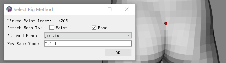 If the "New Bone Name" shows a recommended new bone name, then you are recommended to create a new cloth bone to control this group of vertices. If you keep it or edit it, a new cloth bone will be created and attached to the "Attached Bone". The new bone's origin is at the center of the group of vertices, and has the same orientation with the "Attached Bone". You may check and adjust the bone later. If you do not want to create a new cloth bone, just clear the "New Bone Name".