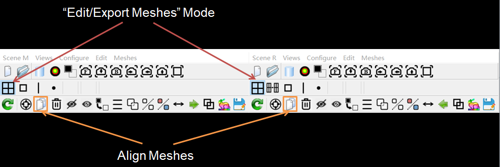 Clicking this button aligns (fine-tune) all visible meshes (source) to all visible meshes (target) in the other scene (middle or right).