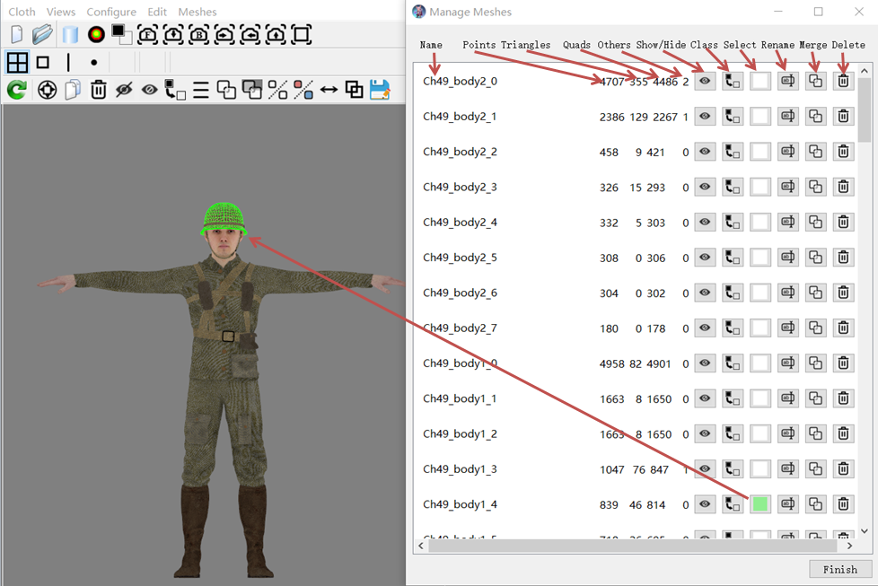 This window lists the following information and operation buttons of all the meshes in this scene.
