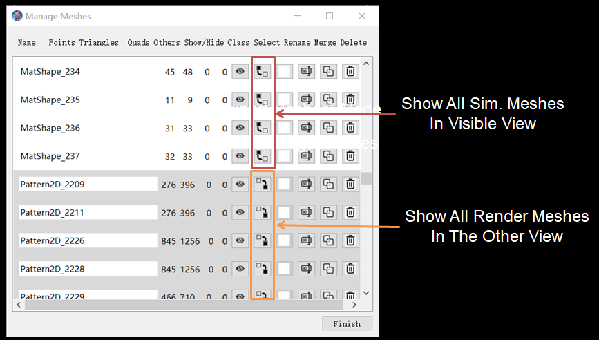 - put all render meshes in the other view (also called back view), and make sure each render mesh's name has the same name as its corresponding sim. mesh or meshes, or is empty so that it uses all sim. meshes as its sim. meshes.