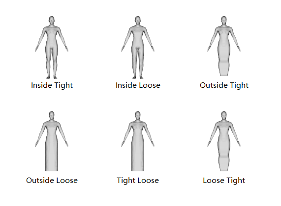 The "Inside Tight" mesh is the original mesh (body) of the character, all the others called body helpers are its derivatives. These meshes are use to dress different types of clothes.