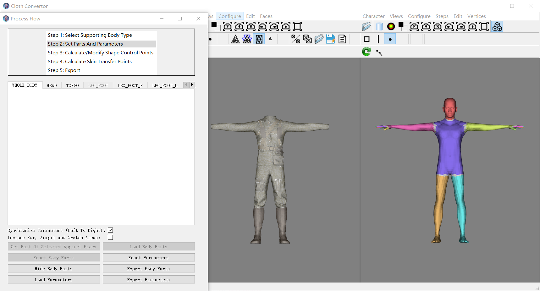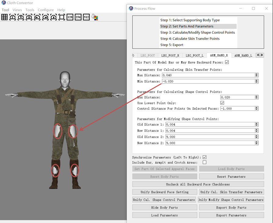 For Cloth Convertor, the default setting for the checkboxes of the HEAD, TORSO, ARM_HAND_R, ARM_HAND_L, LEG_FOOT, LEG_FOOT_R and LEG_FOOT_L parts are checked, so click the "Uncheck All Backward Face Checkboxes" button to uncheck them.