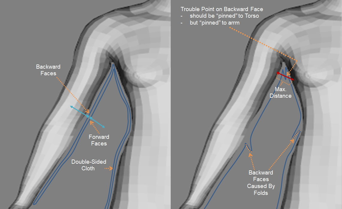For most cloth and character models, the method above works fine. But if the models have double-sided meshes or folds, it may find "trouble" points which are incorrectly "pinned" to wrong body parts as shown in the following figure.