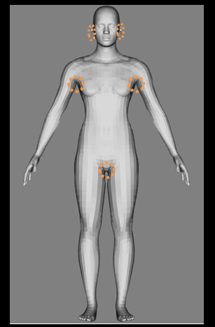 If the "Include Ear, Armpit and Crotch Areas" checkbox is not checked, there are no points corresponding to the vertices of character in these area.