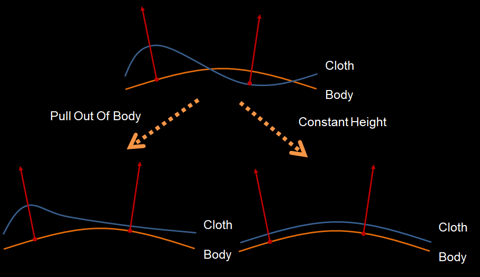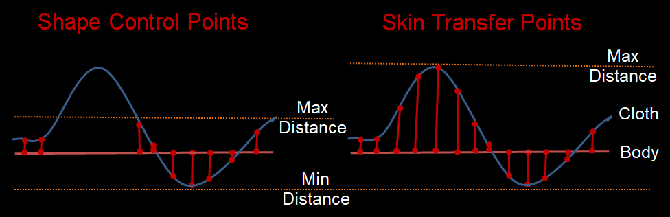 When dressing the cloth to a character, a modified version of the shape control points is used. The modification is on the distance of each point as follows: