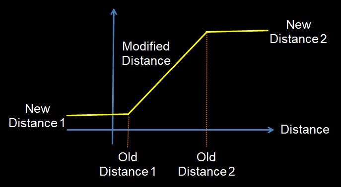 - otherwise modified distance is (distance - "Old Distance 1") * ("New Distance 2" - "New Distance 1") / ("Old Distance 2" - "Old Distance 1");