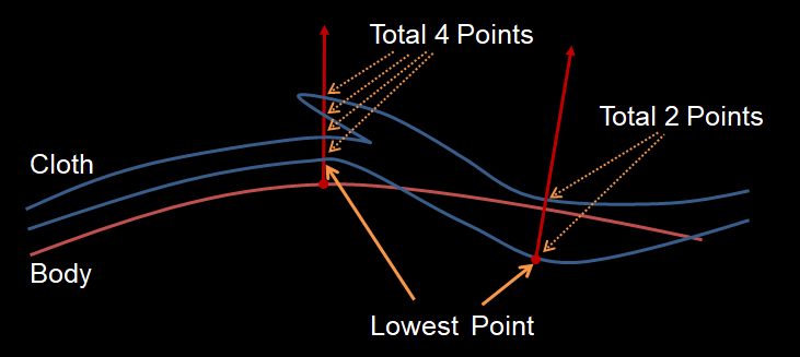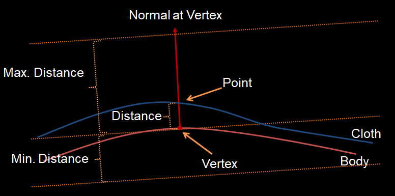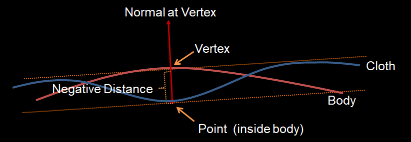 - if a cloth point is inside the body, its distance is negative, as shown in the following figure. This is possible as the body may not have been fit to the cloth very well by the "Match Mesh To Model" operation.