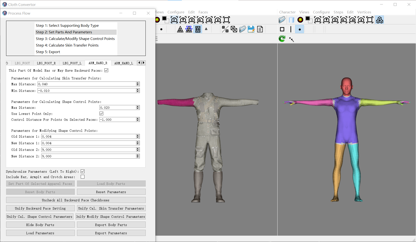 The configuration window allows setting parameters for each class, which are used to calculate (find) the shape control and skin transfer points on the cloth. For each character vertex, its corresponding points on the cloth are found using the following steps.