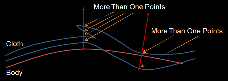 - if the cloth consists of multi layers or is double-sided or has folds, more than one points may be found for a character vertex, as shown in the following figure: