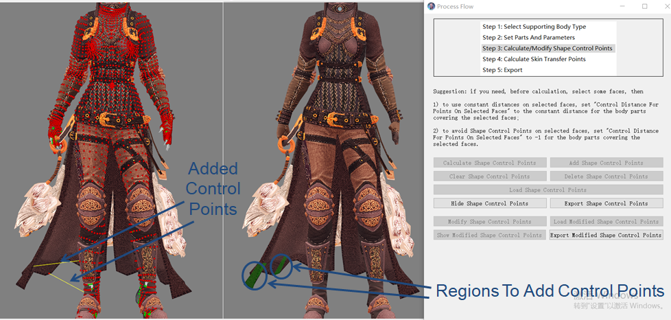 If you want to control some remote regions, select these regions, then click the "Add Shape Control Points" button to add one control points for each region. The tool will try to find the closest character vertex pointing to the region, and creates a control point if it can find the point on the region.
