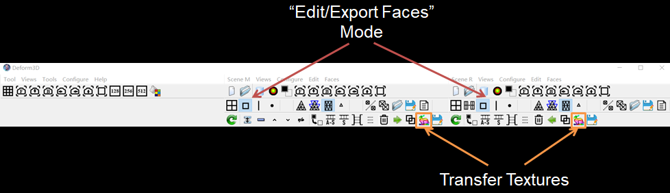 Clicking this button transfers textures of selected faces, or all visible faces if no faces are selected, from the model in other scene (middle or right) using the same process used for meshes.